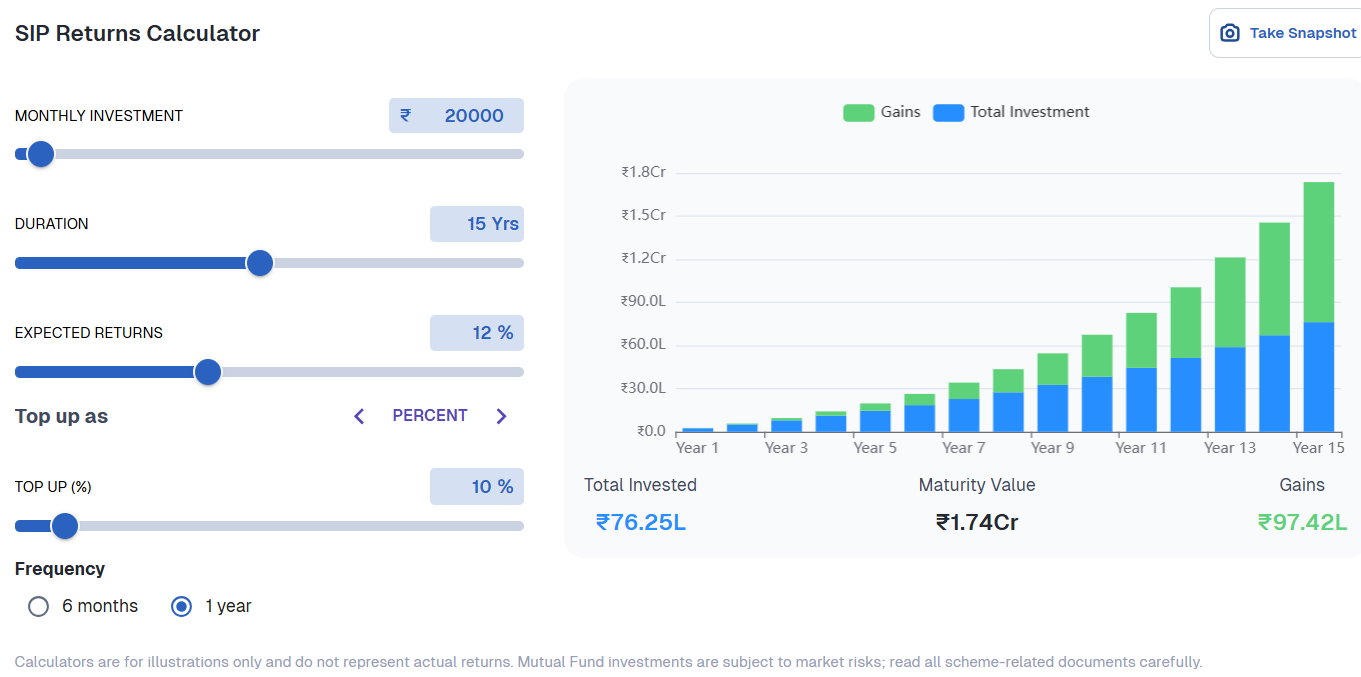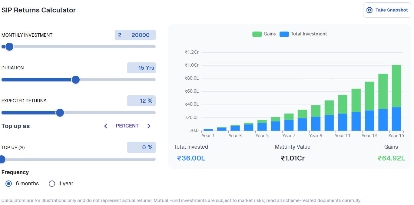 Let’s look at a simple example: If you invest ₹20,000 per month for 15 years, assuming a 12% return, you may accumulate around ₹1 crore.