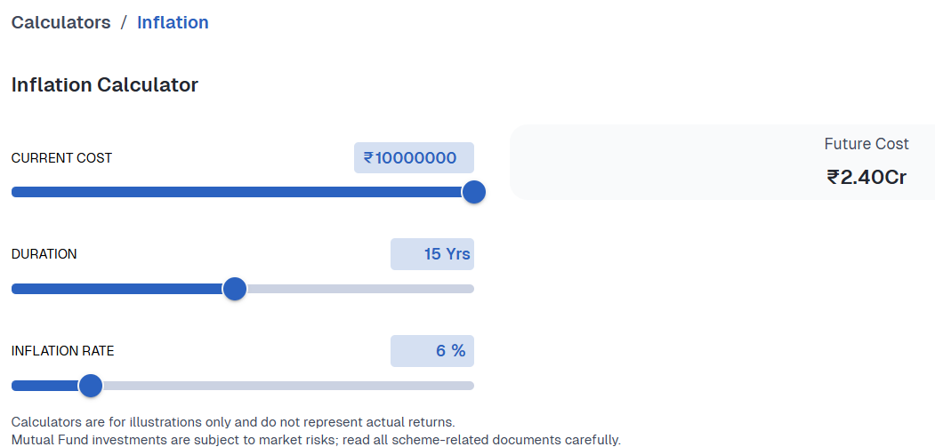 You can calculate the impact of inflation on the purchasing value of money using an inflation calculator. At an average inflation rate of 6%, something that costs ₹1 crore today could cost around ₹2.4 crore in 15 years. That means if your financial goal is fixed at ₹1 crore, you may end up significantly underprepared.