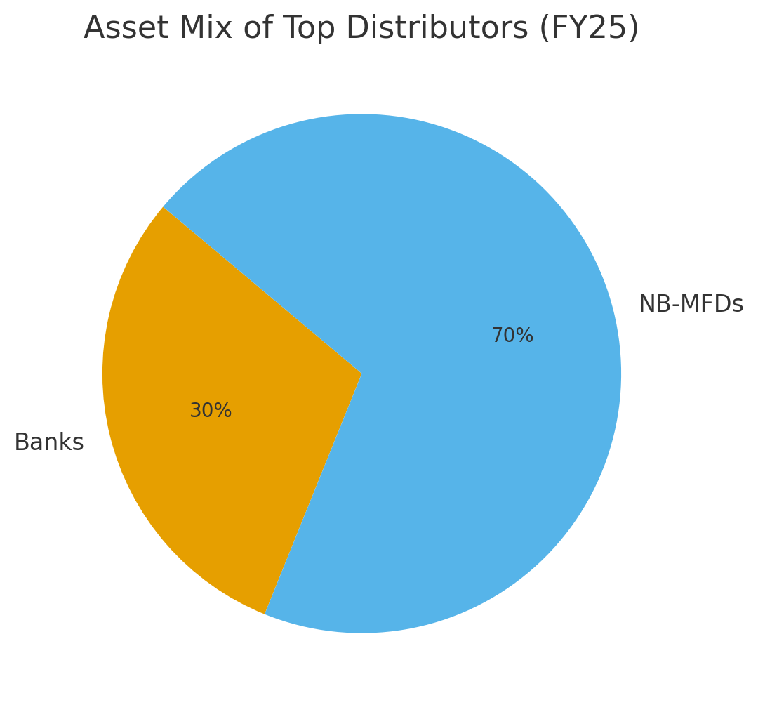 The total AUM managed by top distributors in FY25 touched ₹25 lakh crore, and the split was striking: 70% with NB-MFDs versus 30% with banks.