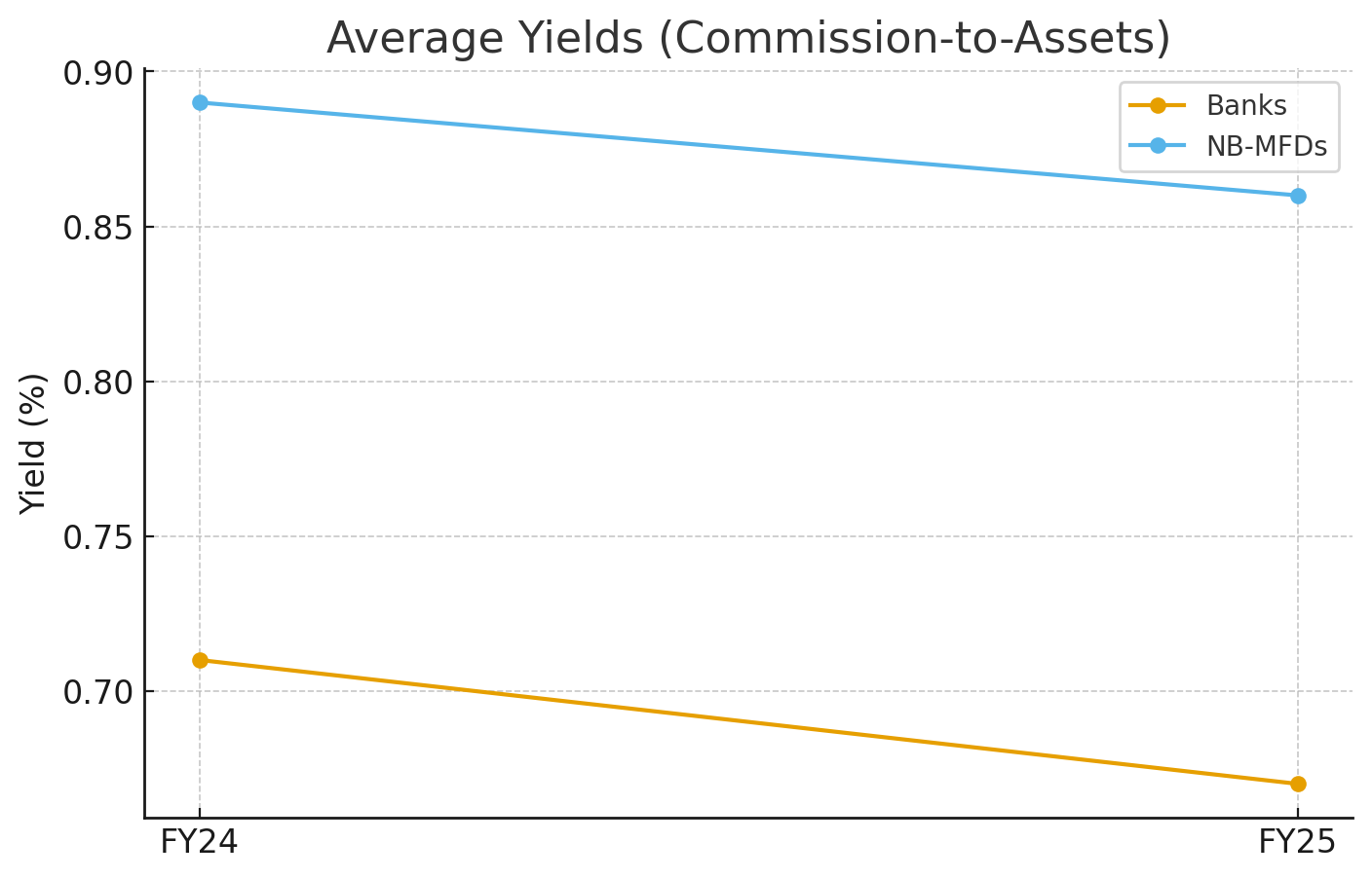 Yield (commission-to-assets): Banks fell from 0.71% → 0.67%, NB-MFDs from 0.89% → 0.86%. Margins are under pressure across the board, but NB-MFDs maintain higher efficiency.