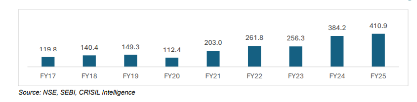 - Market Tailwinds: India’s market cap rose to ₹410.9 trillion in March 2025 (up from ₹384.2 trillion a year earlier), The market capitalization of the National Stock Exchange (“NSE”) grew at 13.8% CAGR during Fiscal 2011 to Fiscal 2025. This consistent growth is creating an equity-friendly environment, a positive for the MF industry.