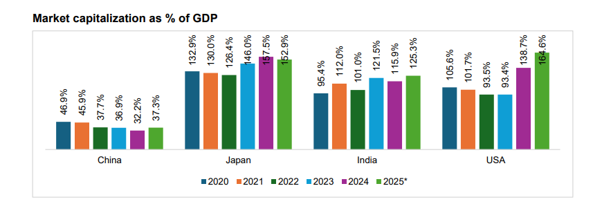 Note: * Data is as of Nov’24 as per World Federation of Exchanges (WFE), Market capitalization of Shanghai stock exchange, Japan exchange group, National stock exchange of India, and New York stock exchange has been considered. GDP data taken as per IMF database (April-2025).